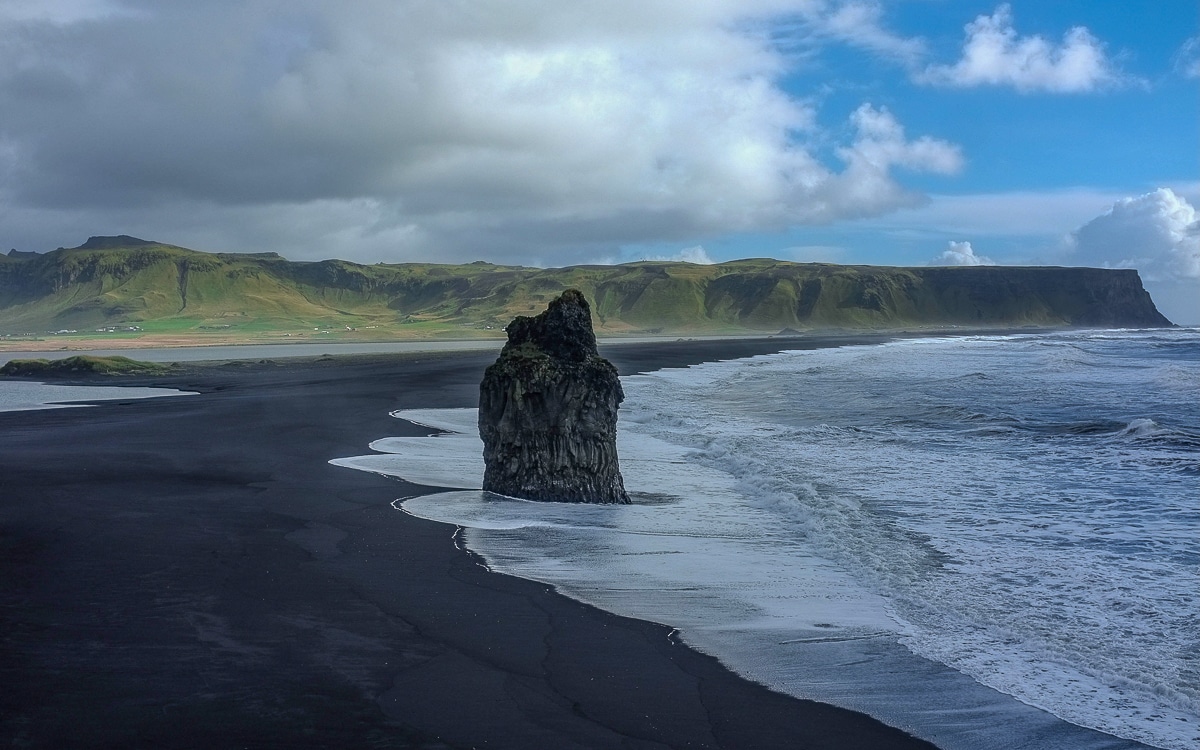 Reynisfjara, černá písečná pláž poblíž Víku, stojí na nejvzdálenější východní straně Zdi, kde seriálová ledová masa klesá do moře.